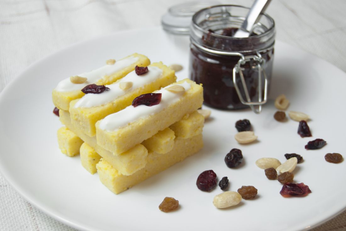 polenta na słodko z serkiem waniliowym, dżemem i bakaliami