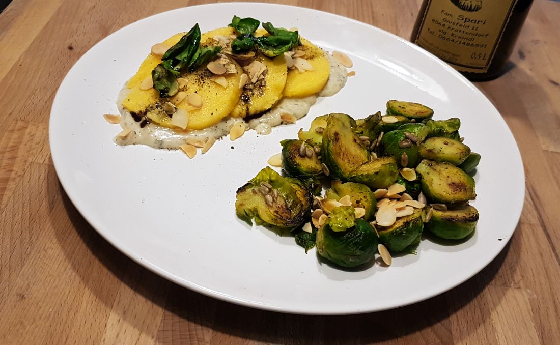 polenta na beszamelu ze smażoną brukselką i olejem z pestek dyni