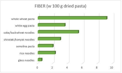 • Vitamins and minerals – pasta is cholesterol free and has very little sodium. Richer varieties of pasta are a good source of essential nutrients, including iron and several B vitamins. Whole wheat pasta, in 100 g, provides up to 25% of daily fiber requirement.