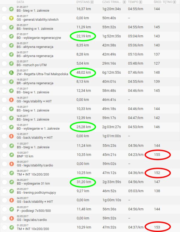 Na liście poniżej zaznaczyłem długie wybiegania (na zielono) oraz średnie tętno towarzyszące mocniejszym akcentom treningowym (na czerwono). Średnie tętno powyżej 150 bpm widoczne jest praktycznie tylko przy mocnych jednostkach, a i to nie wszędzie – zaniżone wskazanie wynika z pierwszych i ostatnich spokojnych kilometrów (rozgrzewka i schłodzenie).