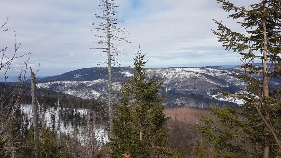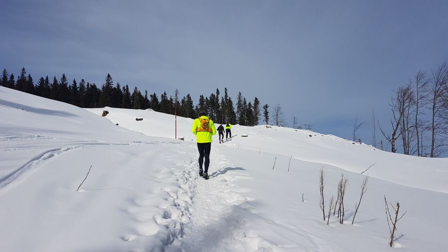 Tym razem spod schroniska ruszyłem już żółtym szlakiem, dobrze mi znaną, wąską ścieżynką udeptaną w śniegu. Tak, jak wcześniejsze, śliskie podejście było testem dla nóg, tak teraz przyszła pora przetestować mięśnie głębokie. Dobrze, że przykładałem się ostatnio do ćwiczenia stabilizacji – każda minuta tych treningów się tu przydała. Jak powiedział „Dzik” na macie – nie postawiłem chyba ani jednego prostego kroku na tym zbiegu. Co więcej, ubita w śniegu ścieżynka tworzyła tylko wąski pasek, nadający się do sprawnego biegu. Postawiłeś krok nieco za bardzo z boku i wylądowałeś po kolano w miękkim śniegu. Ten zbieg nie należał do moich najszybszych, za to na pewno do najbardziej uważnych ;)