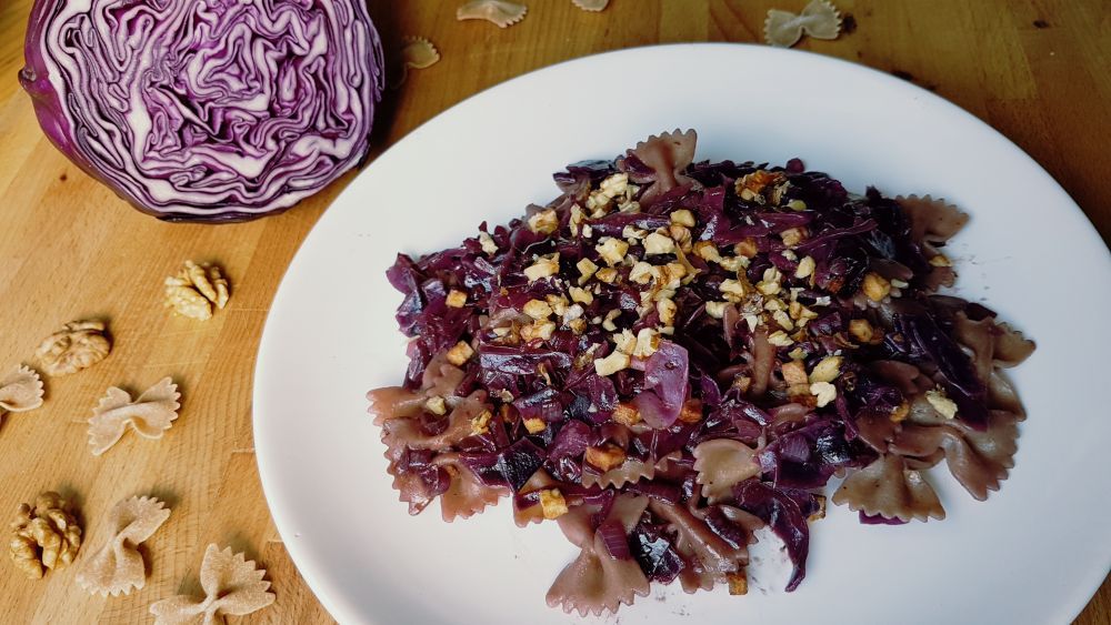 Pełnoziarniste kokardki z czerwoną kapustą, skwarkami z tofu i orzechami to moja wegańska wariacja na temat klasycznych łazanek. Danie jest ciekawsze wizualnie i bogatsze odżywczo. Idealne dla wege biegacza!