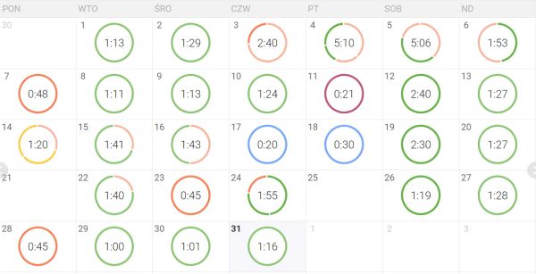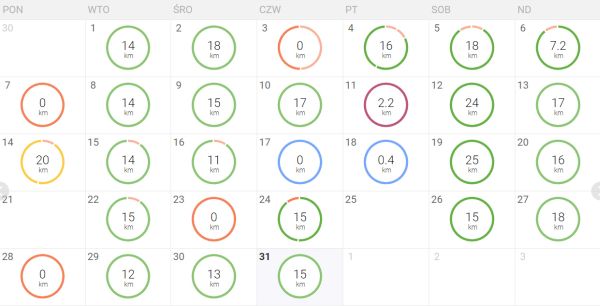 W maju przebiegłem 332 km, spalając 19 317 kalorii. W tygodniu zawsze mocne treningi jakościowe, głównie po płaskim, w weekendy natomiast bieganie w terenie – długie wybiegania albo starty. Na zdjęciach z Endomondo odpowiednio zaznaczone zostały: ćwiczenia siłowe, rower, joga, basen oraz bieganie.