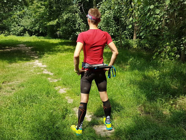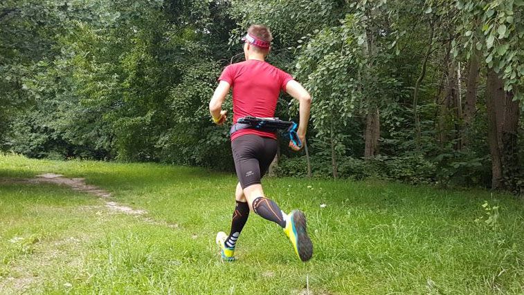 Wygoda użytkowania – Pas został wymyślony po to, żeby nie musieć na każde wybieganie w terenie brać kamizelki/plecaka biegowego – w końcu nie zawsze potrzebujemy zabierać aż tyle gratów, a po co biegać z pustym plecakiem. Najwygodniej jest zatem wykorzystywać pas ARCh-Max do typowego dłuższego wybiegania w terenie, gdzie potrzebujesz telefon, zapas wody, żele/batony i jakieś drobne. Przy takim obciążeniu na pewno nic nie będzie skakać. Biegnie się z pasem bardzo wygodnie, praktycznie go nie czuję i po chwili zapominam, że go w ogóle mam na sobie. Nie przesuwa się ani w jedną ani w drugą stronę.