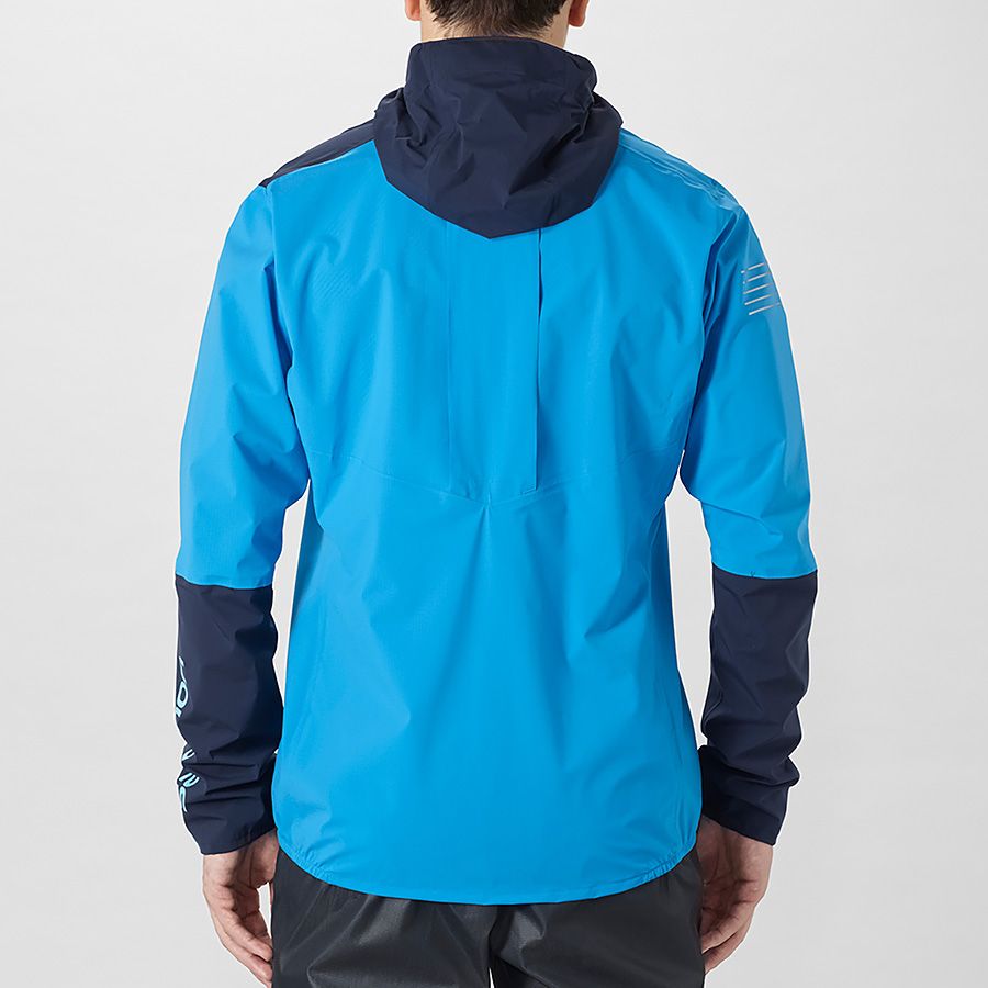 Kurtki przeciwdeszczowe często wykonane są z materiału, który sprawia wrażenie, jakbyśmy się owijali ceratą. Salomon Bonatti PRO WP JKT wybija się na tle innych przeciwdeszczówek. Owszem, wewnętrzna powierzchnia jest delikatnie plastikowa, ale bardzo przyjemna w dotyku i nie klei się do ciała, jak inne „ceratowce”. Zakładam ją z przyjemnością. Jest świetnie skrojona: długość rękawów, jak i całej kurtki – idealna. Nie opina, ale też nie jest za luźna, przy czym tył kurtki jest tak zszyty, żeby zmieścić plecak biegowy. Waży niecałe 200 g i można ją spakować samą w siebie (w kieszeń na klatce piersiowej). Kaptur wyposażony jest w miękki daszek. I co najważniejsze – spełnia rygorystyczne normy większości biegów górskich, w tym UTMB!
