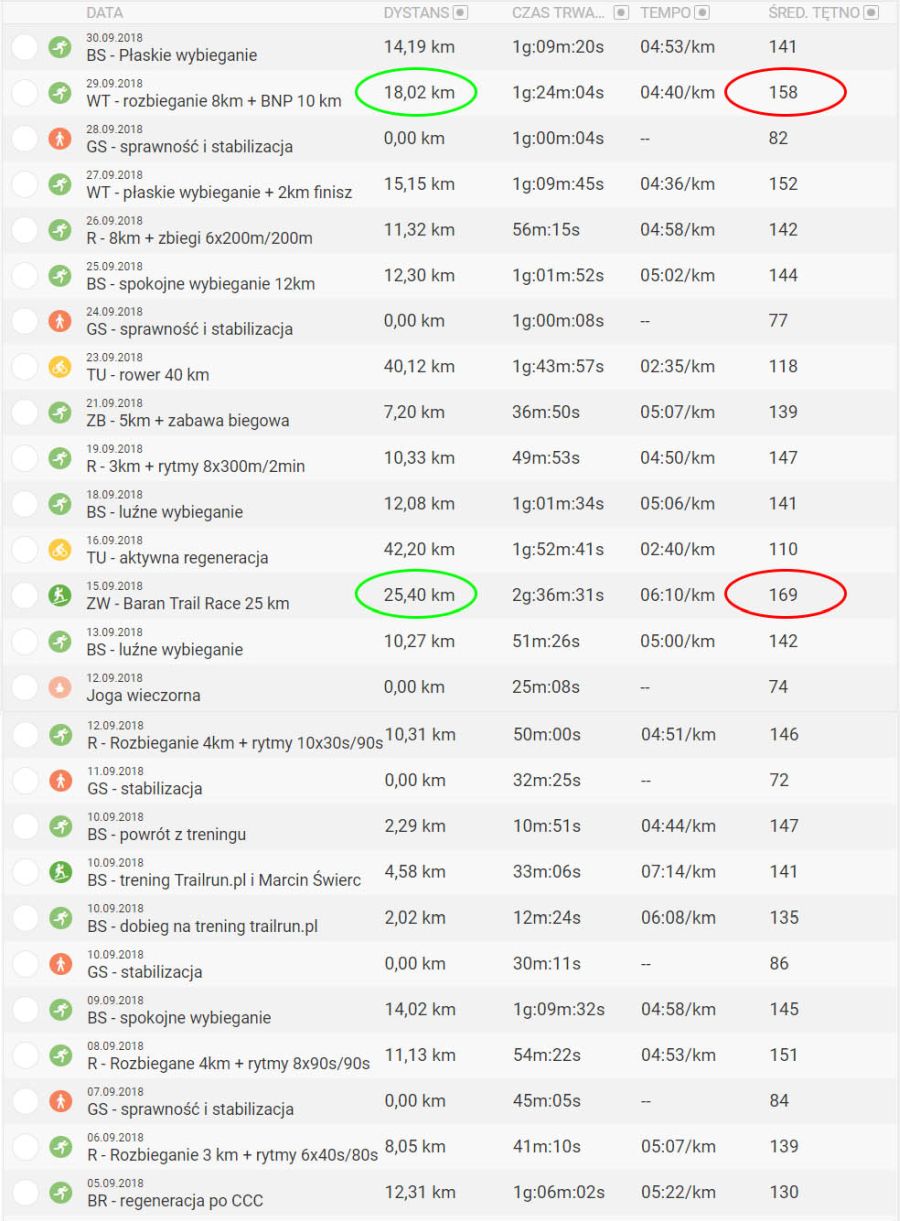 To już jednak koniec sezonu, więc powoli wyhamowuję z objętościami i obciążeniem. Koniec miesiąca to jeszcze ostatnie mocne treningi przed październikową Łemkowyną, po której planuję już roztrenowanie.